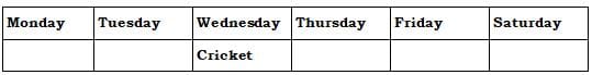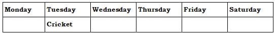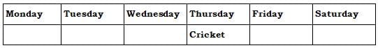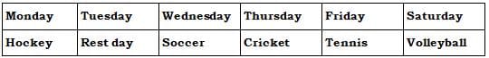 Aayush’s playing schedule consists of Cricket, Hockey, Soccer, Tennis, and Volleyball from Monday to Saturday; each game is on one day, one day being a rest day.