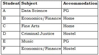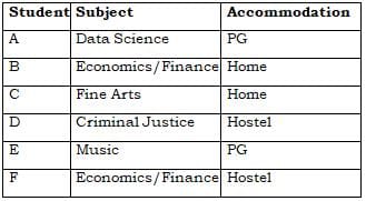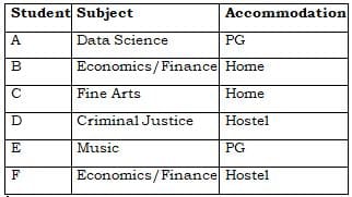 A, B, C, D, E and F are six students procuring their Master’s Degree in six different subjects—Data science, Finance, Criminal Justice, Fine arts, Economics and Music.