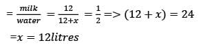 The ratio of milk and water in a mixture of 24 liters is 1:1. How much water must be added to the mixture so that the ratio of milk and water be 1:2?