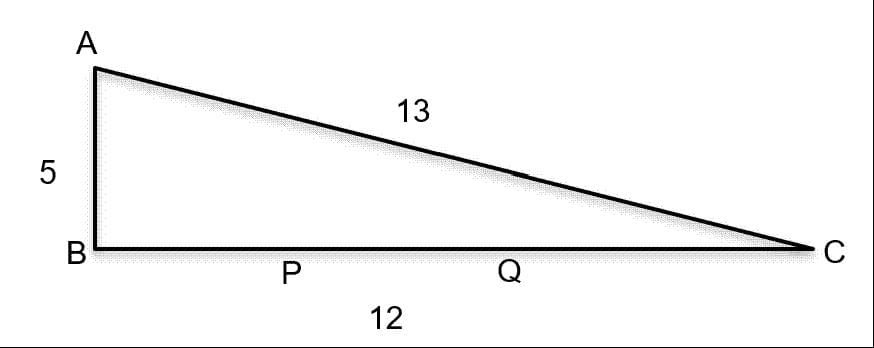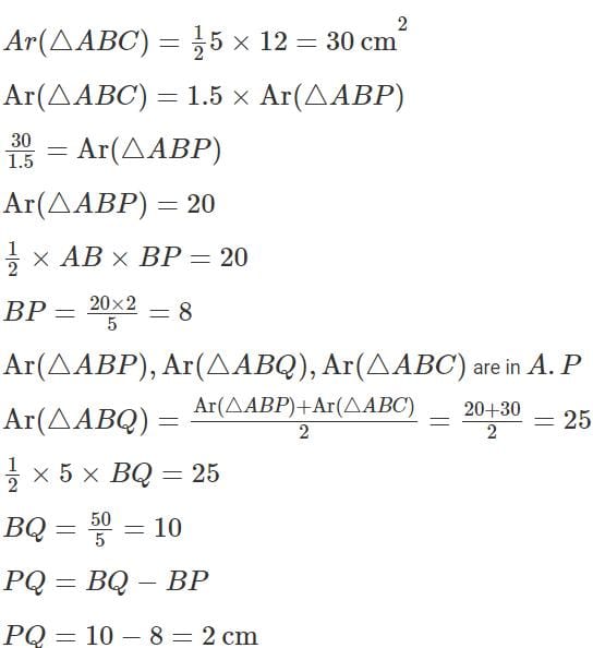 In a right-angled triangle ABC, the altitude AB is 5 cm, and the base BC is 12 cm. P and Q are two points on BC such that the areas of ΔABP, ΔABQ and ΔABC are in arithmetic progression. If the area of ΔABC is 1.5 times the area of ΔABP, the length of PQ, in cm, is