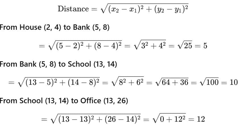 (Assume that all distances covered are in straight lines). If the house is situated at (2, 4), bank at (5, 8), school at (13, 14) and office at (13, 26) and coordinates are in km.