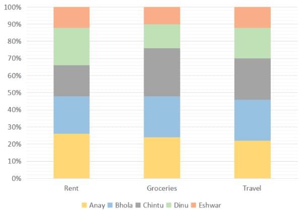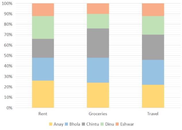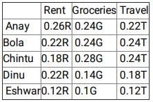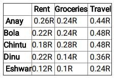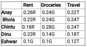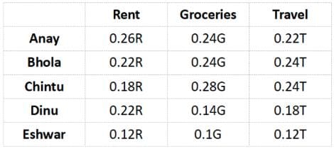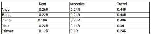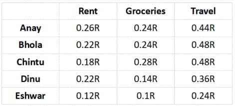 5 friends Anay, Bhola, Chintu, Dinu and Eshwar spend their entire salary on Rent, Groceries and Travel. The following graph shows the amount of money spent by each of the 5 friends on a particular expense as a percentage of the total amount of money spent by all of the 5 friends on a particular expense. For example, if the amount spend by all the friends on Rent is ‘R’ then the amount spent by Anay on rent is 0.26R. The total amount of money spent by exactly 3 friends is equal.