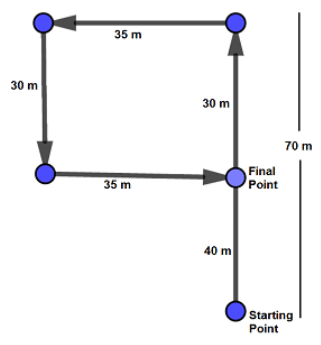 Stayen starts walking towards North. After walking 70 m, he turns to left and walks 35 m straight. He then turns to left and walks 30 m, again he turns to left and walks a distance of 35 m. How far is he from the starting point and in which direction?