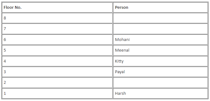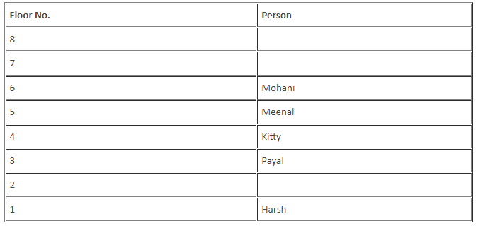Only one person lives between the floors of Payal and Meenal. Harsh lives on an odd-numbered floor, but not on floor number 7. Only two persons live between the floors of Harsh and Kitty.