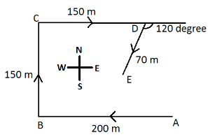 Puneet started from his house for a walk and walked 200 m towards west. He turned to the right and walked 150 m. After that, he turned to his right and walked 150 m. After this, he took a turn to his right by 120° and covered 70 m. Which direction is he facing now?