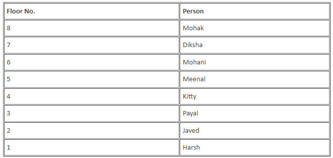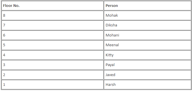 Eight persons, namely, Meenal, Kitty, Mohak, Diksha, Javed, Mohani, Payal and Harsh live on separate floors of an eight-floor building, but not necessarily in the same order.