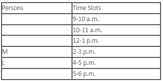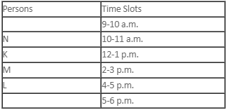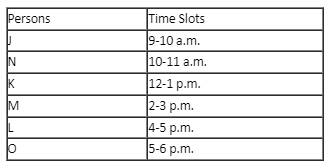 Six persons J, K, M, N, O and L are going to attend a meeting in six different time slots 9-10 a.m, 10-11 a.m, 12-1 p.m, 2-3 p.m, 4-5 p.m. and 5-6 p.m. of a day but not necessarily in the same order.