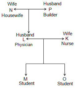 A family consists of six members - K, L, M, N, O and P. There are two married couples. L is a physician and the father of O. P is the grandfather of M and is a builder. N is the grandmother of O and is a housewife. There are a physician, a nurse, a housewife and two students in the family.