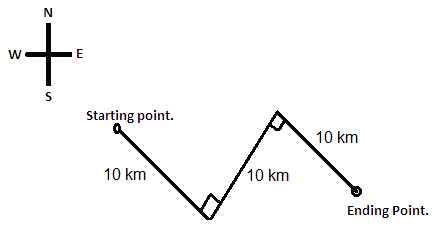 Vijendra walks 10 km to his southeast side. From there, he turns 90 degrees anticlockwise and walks 10 km, and then again turns 90 degrees clockwise and travels 10 km. In which direction is he from his original position?