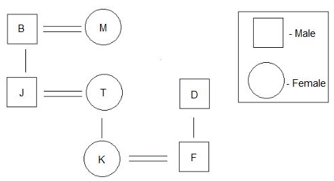 B, D, F, J, K, M and T are seven members of a family. No member has more than one child. D is the father-in-law of K, who is the granddaughter of B. F is the son-in-law of T, who is the daughter-in-law of B. M is J's mother and is married to B.