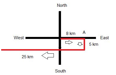 Sunita walked 8 km towards east to reach a point A. Then she turned right and walked 5 km. Again she took a right turn and walked 25 km. What is the total distance covered and in which direction is Sunita now from the starting point?