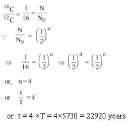 fossil bone has a C14: C12 ratio, which is [1/16] of that in a living animal bone. If the half-life of C14 is 5730 years, then the age of the fossil bone is