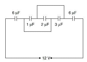 The figure shows five capacitors connected across a 12 V power supply. What is the charge on the 2μF capacitor?