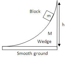A block of mass m slides down a wedge of mass M as shown. The whole system is at rest, when the height of the block is h above the ground. The wedge surface is smooth and gradually flattens. There is no friction between wedge and ground.