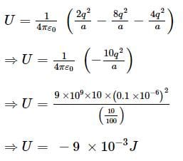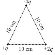 Three points charges +q, +2q and −4q where q = 0.1 μC, are placed at the vertices of an equilateral triangle of side 10 cm as shown in figure. The potential energy of the system is