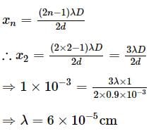 In a Young's experiment, two coherent sources are placed 0.90 mm apart and the fringes are observed one metre away. If it produces the second dark fringe at a distance of 1 mm from the central fringe, the wavelength of monochromatic light used would be