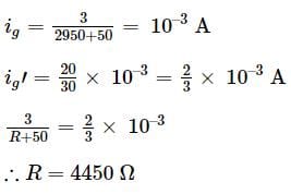 A galvanometer of resistance 50 Ω is connected to a battery of 3 V, along with a resistance of 2950 Ω in series. A full-scale deflection of 30 divisions is obtained in the galvanometer. In order to reduce this deflection to 20 divisions, the resistance in series should be