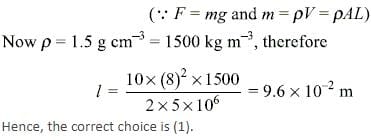 A thick uniform rubber rope of density 1.5 g cm-3 and Young's modulus 5 x106 Nm-2 has a length of 8 m. When hung from the ceiling of a room, the increase in length of the rope due to its own weight will be
