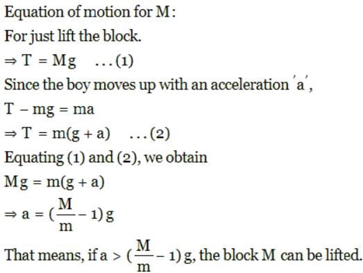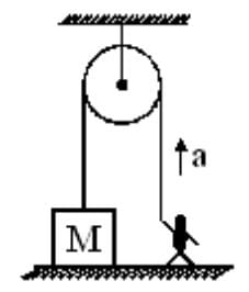 In the given figure, the block of mass M is at rest on the floor. The acceleration with which a boy of mass m should climb along the rope of negligible mass so as to lift the block from the floor, is