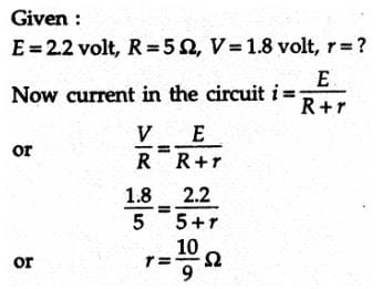 The potential difference between the terminals of a cell in open circuit is 2.2 volt with resistance of 5 ohm across the terminals of a cell, the terminal potential difference is 1.8 volt. The internal resistance of the cell is