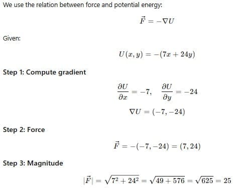 A particle of mass 5 kg moving in the x−y plane has its potential energy given by U = (−7x+24y) Joule, x and y