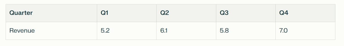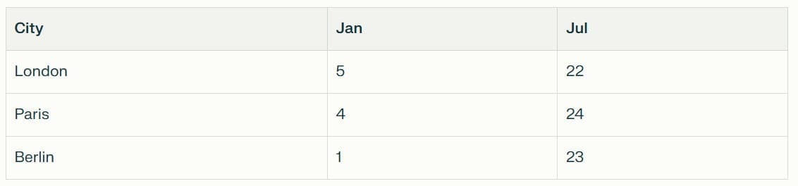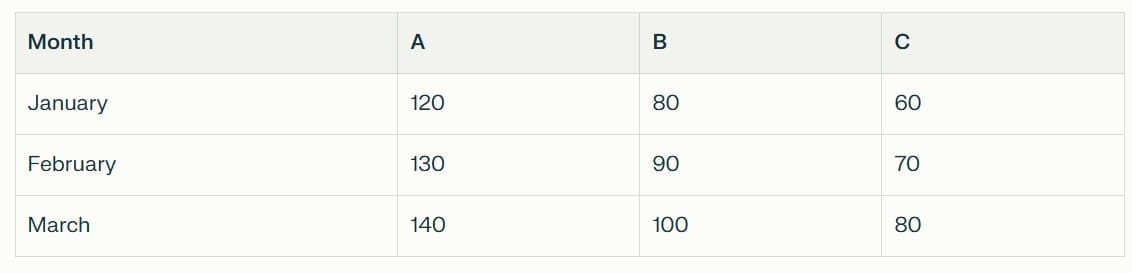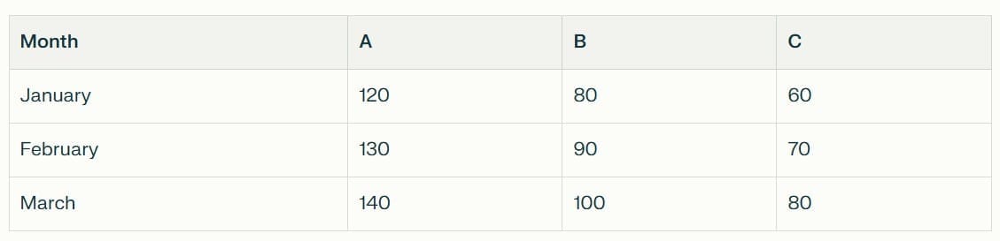 The table below shows monthly sales (in £000s) for a store across products A, B, and C in 2024.