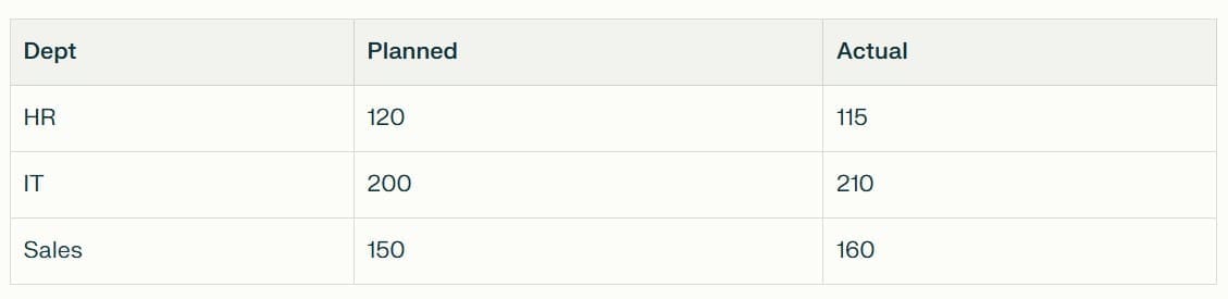 Which department had the largest % variance (actual vs planned)?