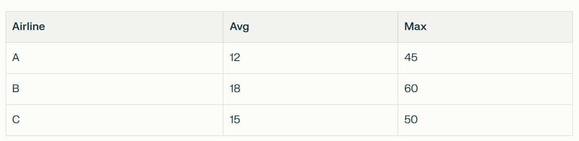 Which airline has the highest max/avg ratio?