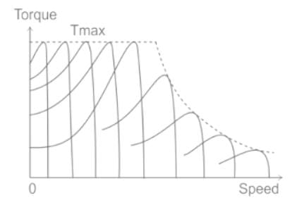 A constant V/f controlled induction motor is fed from a variable voltage variable frequency three phase voltage source inverter. The motor is operated within the base speed. Which of the following is true in torque-speed characteristics of this motor?