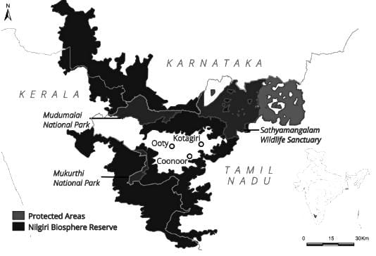 Which protected areas are present within the Nilgiri Biosphere Reserve?