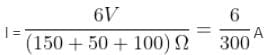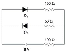 The circuit shown in the figure contains two diodes D1 and D2, each with a forward resistance of 50 ohms and infinite backward resistance. If the battery voltage is 6 V, the current (in amperes) through the 100 ohm resistance is