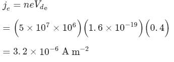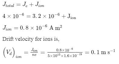 An ionization chamber with parallel conducting plates as anode and cathode has 5 × 107 electrons and the same number of singly-charged positive ions per cm3. The electrons are moving at 0.4 m s−1. The current density from anode to cathode is 4 μA m−2. The velocity of positive ions moving towards cathode is V, find 100V in m/s.