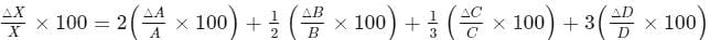 In an experiment, the percentage of error occurred in the measurement of physical quantities A, B, C and D are 1%, 2%, 3% and 4%, respectively. Then the maximum percentage of error in the measurement X, where