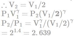 A cylinder with a movable piston contains 3 moles of hydrogen at standard temperature and pressure. The walls of the cylinder are made of a heat insulator, and the piston is insulated by having a pile of sand on it. By what factor does the pressure of the gas increase if the gas is compressed to half its original volume?