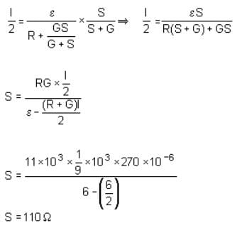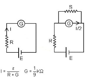 In a circuit for finding the resistance of a galvanometer by half deflection method, a 6 V battery and a high resistance of 11 kΩ are used. The figure of merit of the galvanometer is 60 μA/division. In the absence of shunt resistance, the galvanometer produces a deflection of θ = 9 divisions, when current flows in the circuit. The value of the shunt resistance that can cause the deflection of θ/2 is closest to: