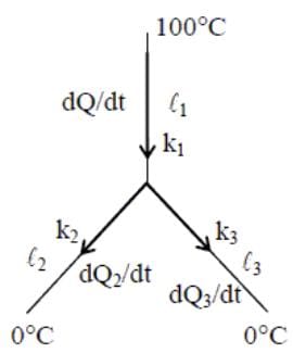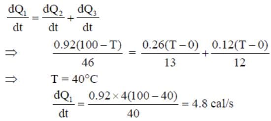 Three rods of Copper, Brass and Steel are welded together to from a Y –shaped structure. Area of cross – section of each rod = 4 cm2. End of copper rod is maintained at 100°C where as ends of brass and steel are kept at 0°C. Lengths of the copper, brass and steel rods are 46, 13 and 12 cms respectively. The rods are thermally insulated from surroundings except at ends. Thermal conductivities of copper, brass and steel are 0.92, 0.26 and 0.12 CGS units respectively. Rate of heat flow through copper rod is