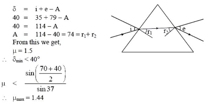 In an experiment for determination of refractive index of glass of a prism by i – δ plot, it was found that a ray incident at an angle of 35° suffers a deviation of 40° and that it emerges at an angle of 79°. In that case, which of the following is closest to the maximum possible value of the refractive index?