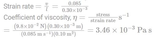 A metal block of area 0.10 m2 is connected to a 0.01 kg mass via a string that passes over a massless and frictionless 0.01 kg pulley as shown in the figure. A liquid with a film thickness of 0.3 mm is placed between the block and the table. When released the block moves to the right with a constant speed of 0.085 ms-1. The coefficient of viscosity of the liquid is: (Take g = 10 ms-2)