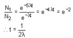 Two radioactive substances A and B have decay constants 5λ and λ, respectively. At t = 0, a sample has the same number of the two nuclei. The time taken for the ratio of the number of nuclei to become (1/e)2 will be: