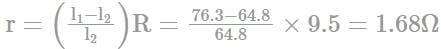 The figure shows a 2.0 V potentiometer used for the determination of the internal resistance of a 1.5 V cell. The balance point of the cell in the open circuit is 76.3 cm. When a resistor of 9.5 Ω is used in the external circuit of the cell, the balance point shifts to 64.8 cm of the potentiometer wire. Determine the internal resistance of the cell.