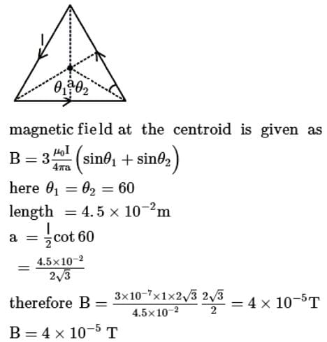 A current of 1 A is flowing on the sides of an equilateral triangle of side 4.5 × 10-2 m. The magnetic field at the centroid of the triangle will be:
