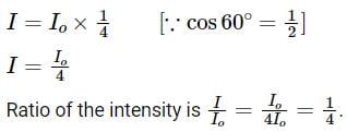 A light of intensity I0 is incident on a Polaroid which placed at 30º . Find the ratio of the intensity of light after and before polarization, if the light is polarized when Polaroid is at 60º.