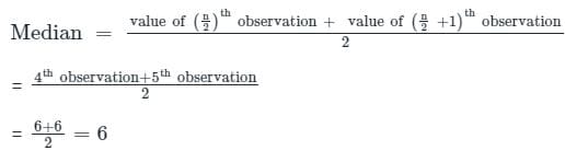 Median = 1/2[(n/2)th term + {(n/2) + 1}th] term when n is even