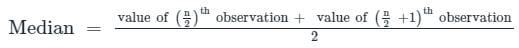 Median  = [(n/2)th term + {(n/2)+1}th term]/2