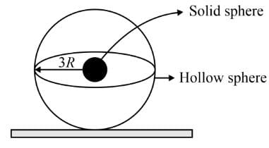 A solid ball of mass m and radius R is released from the position shown in a large hollow fixed shell of same mass m and radius 3R as shown in the figure. The displacement of the centre of mass of the system from its initial position when the solid ball touches the lower surface of the hollow shell is (centres of both the spheres coincide initially):