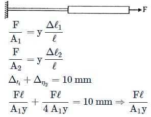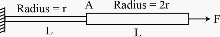 Two steel wires of same length but radii r and 2r are connected together end to end and tied to a wall as shown. The force stretches the combination by 10 mm. How far does the midpoint A move. (in mm)