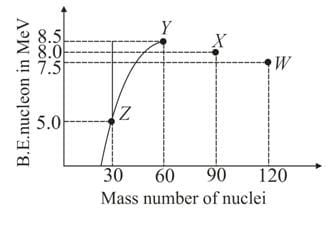 Binding energy per nucleon verses mass number curve for nuclei is shown in the figure. W, X, Y and Z are four nuclei indicated on the curve. The process that would release energy is :-