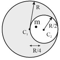 A solid sphere of mass M and radius R has a spherical cavity of radius R/2 such that the centre of the cavity is at distance R/2 from the centre of the sphere. A point mass m is placed inside the cavity at a distance R/4 from the centre of the sphere. The gravitational pull between the sphere and the point mass m is