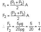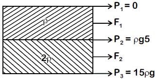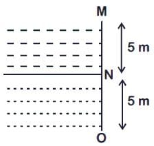 are filled up behind a square wall of side 10 m as shown in figure. Each liquid has a height of 5 m. The ratio of the forces due to these liquids exerted on upper part MN to that at the lower part NO is: (Assume that the liquids are not mixing)