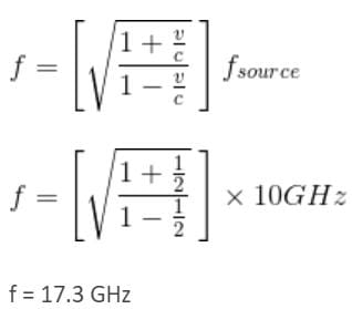 An observer is moving with half the speed of light towards a stationary microwave source emitting waves at frequency 10 GHz. What is the frequency of the microwave measured by the observer?